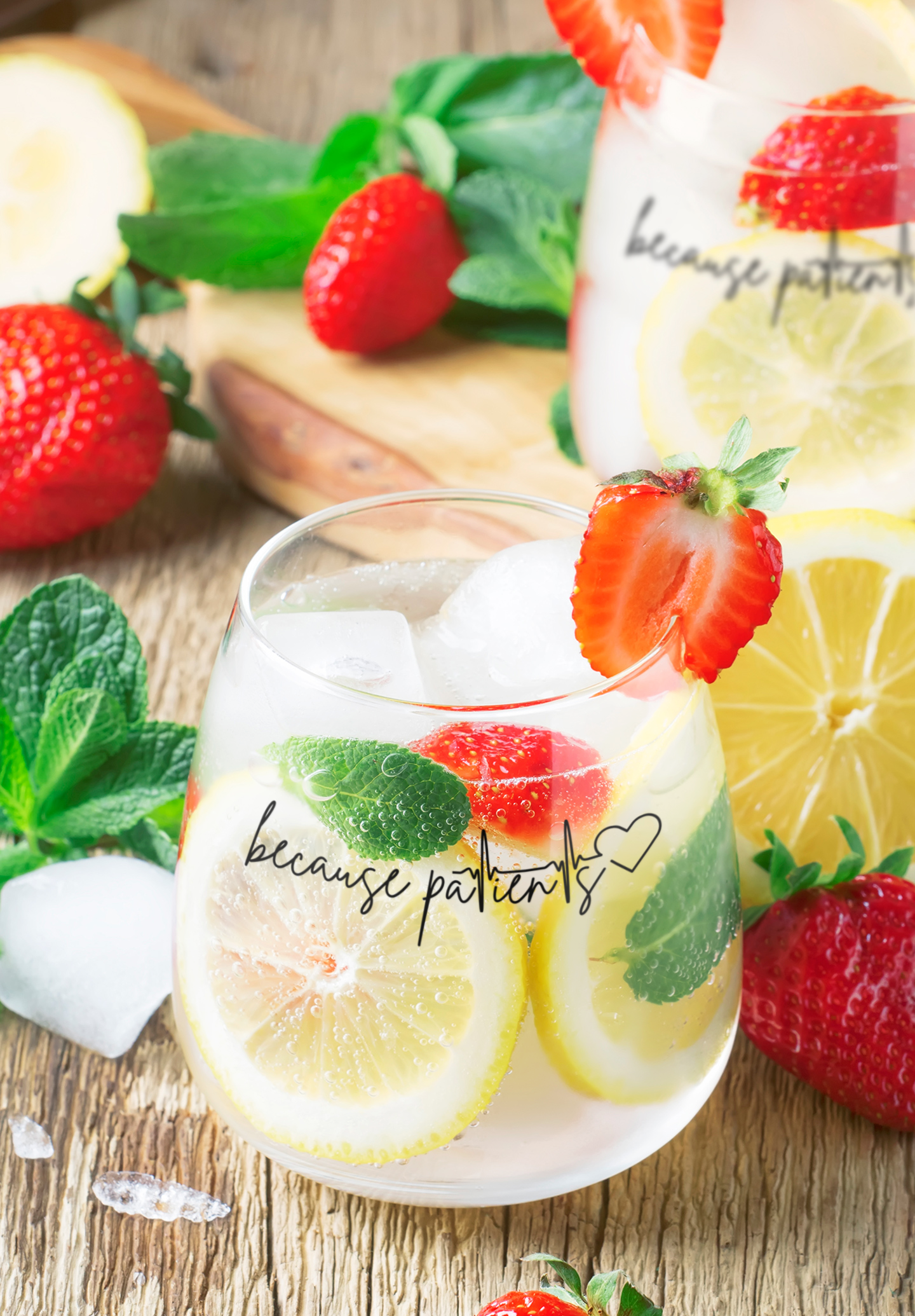Because Patients Stemless wine glass with black text